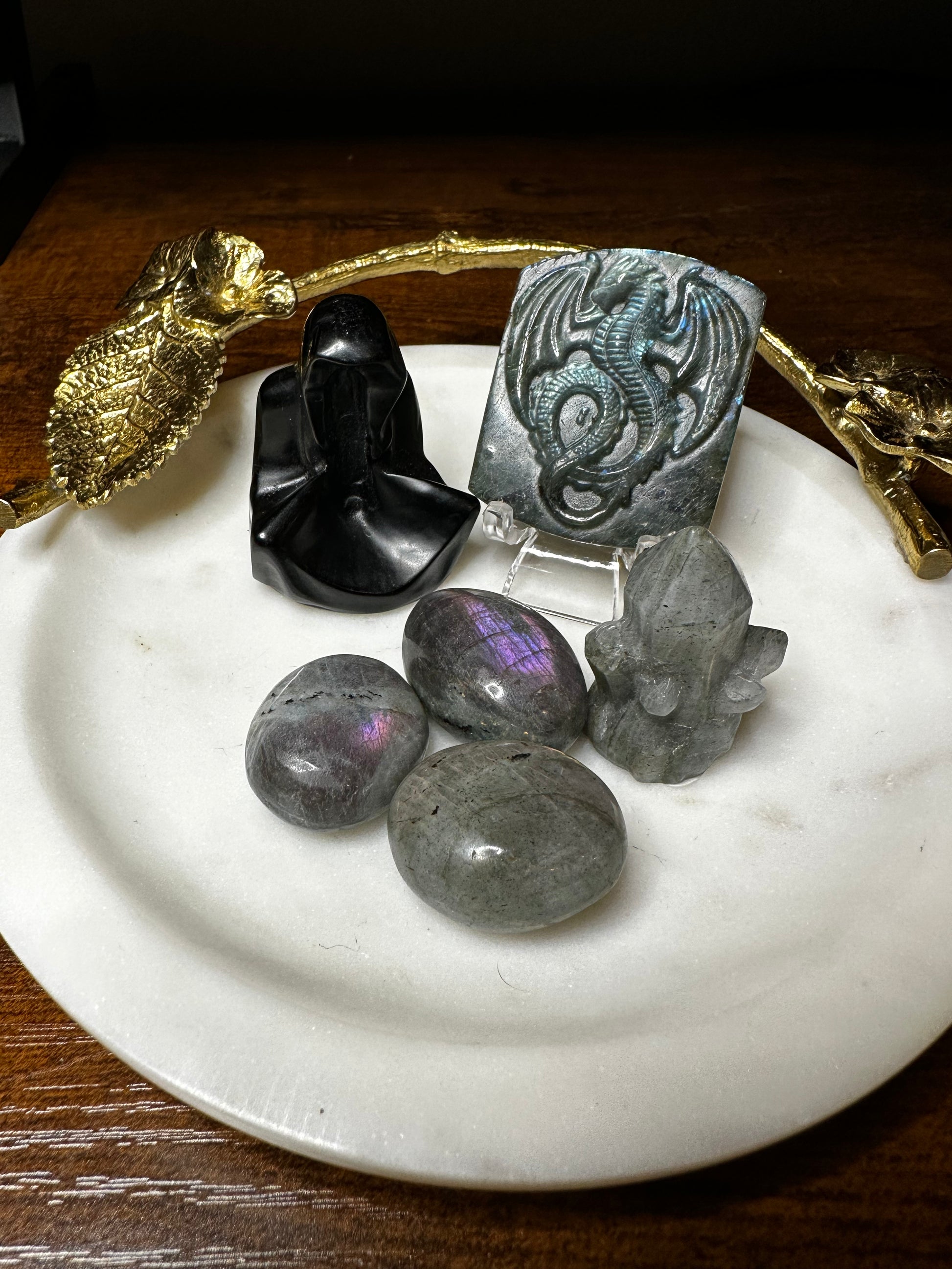 Black Obsidian Suriel Carving: $24A + Labradorite Dragon Carving: $26G + Labradorite Crystal Cluster Carving: $9J + Labradorite Tumbles (x3@$4): $12.