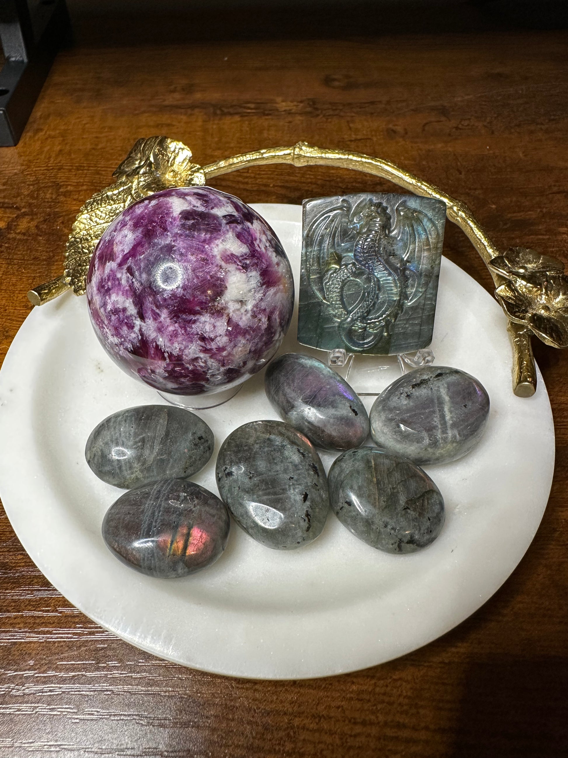 Spark Lepidolite Sphere: $50H + Labradorite Dragon Carving: $26P + Lab Tumbles (x6@$4): $24! Paid $10 New Customer Deposit!