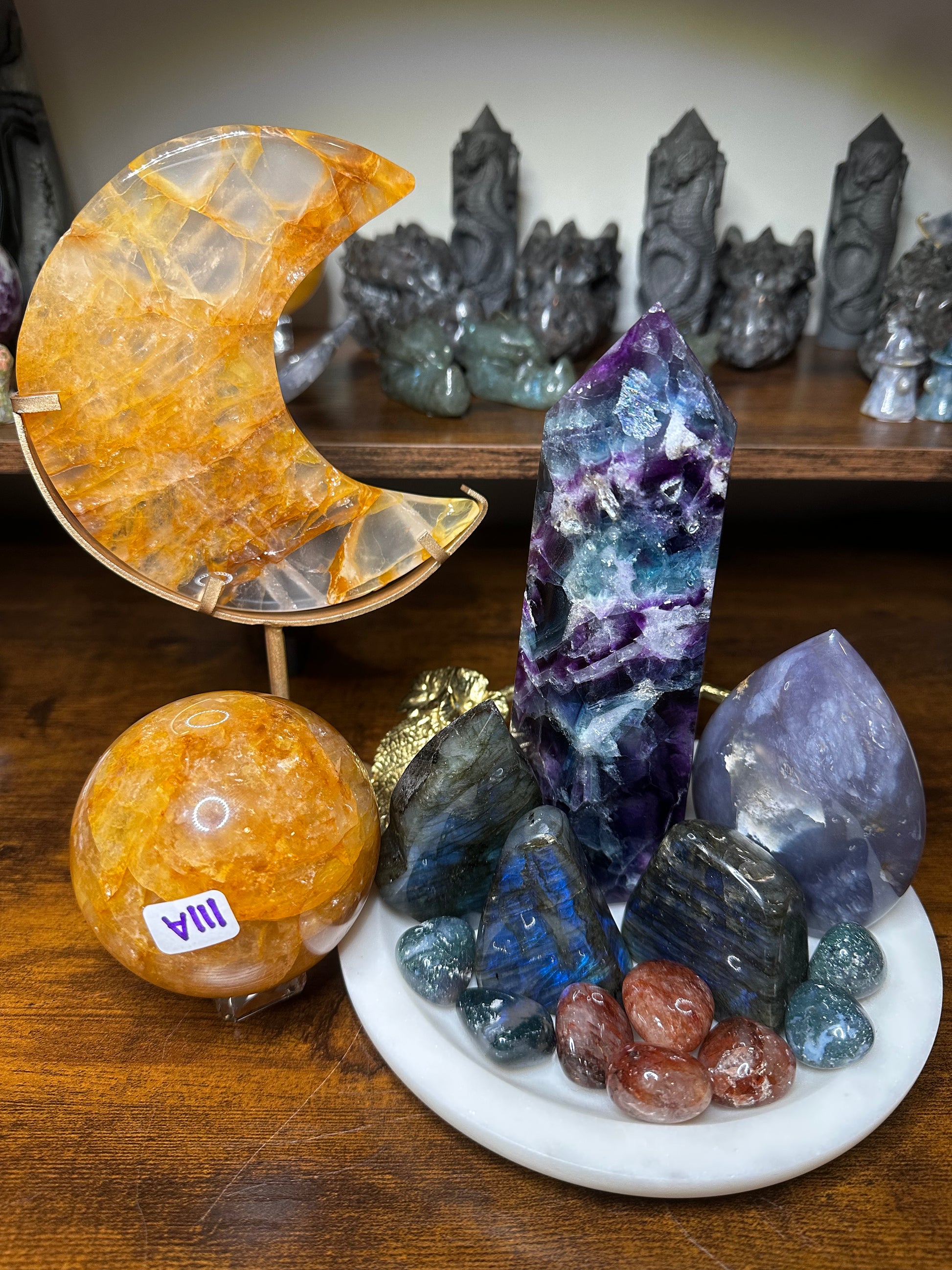 Golden Healer Moon: $96G + Golden Healer Sphere: $111A + Fluorite Tower: $128H + Labradorite Leaf: $26N + Purple Chalcedony Flame/Free Form: $46V + Labradorite Free Form: $14J + Labradorite Free Form: $20L + Fire Quart Tumbles (x4@$2): $8 + Moss Agate Tumbles (x4@$1): $4.